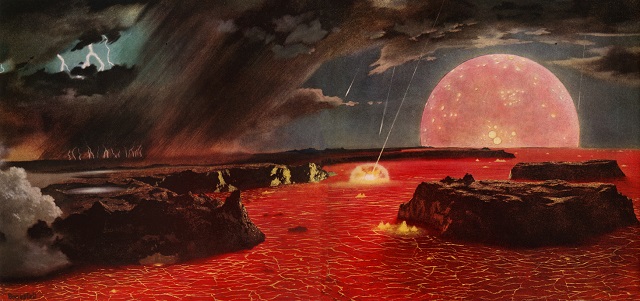 Un planeta del tamaño de Marte, bautizado por la comunidad científica como Theia, colisionó contra la Tierra hace 4.500 millones de años. El impacto fue de increíbles dimensiones, tanto que si no hubiera chocado de manera tangencial, nuestro planeta no habría sobrevivido para contarlo. Los restos de la explosión arrojaron al espacio tal cantidad de escombros que al reunirse por la acción de la gravedad formaron la Luna proporcionando por aquel entonces una vista espectacular a la par que infernal.