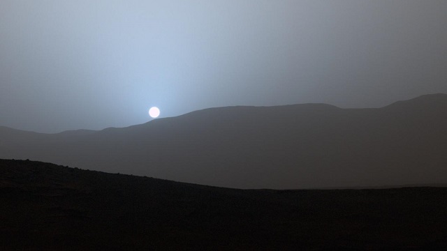 Por sacar una objeción destacable, se ha perdido una oportunidad de oro para mostrar el verdadero color del atardecer marciano: azulado, y no rojizo, como bien se puede apreciar en esta fotografía real tomada por el robot Curiosity desde la superficie: